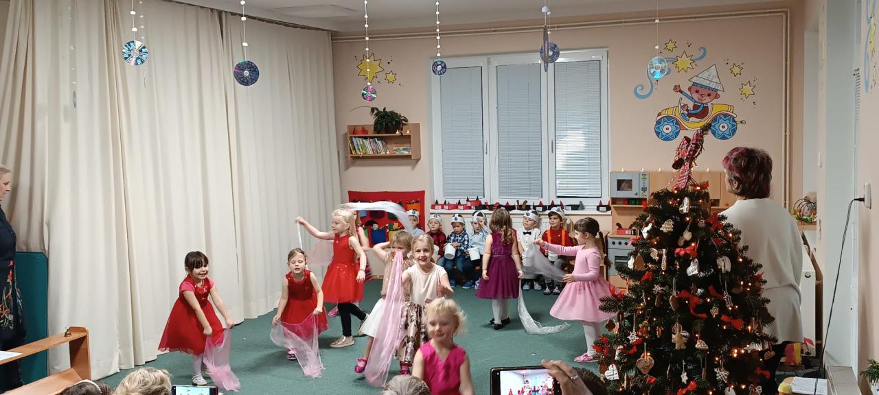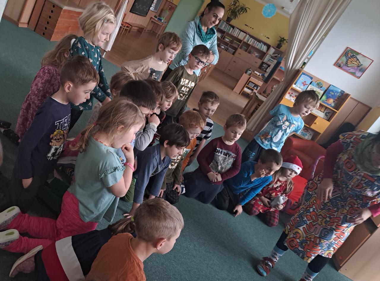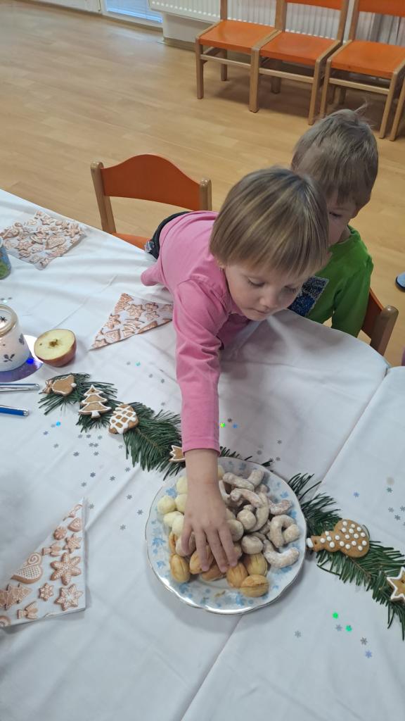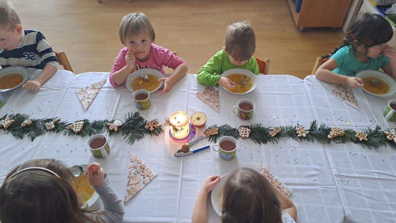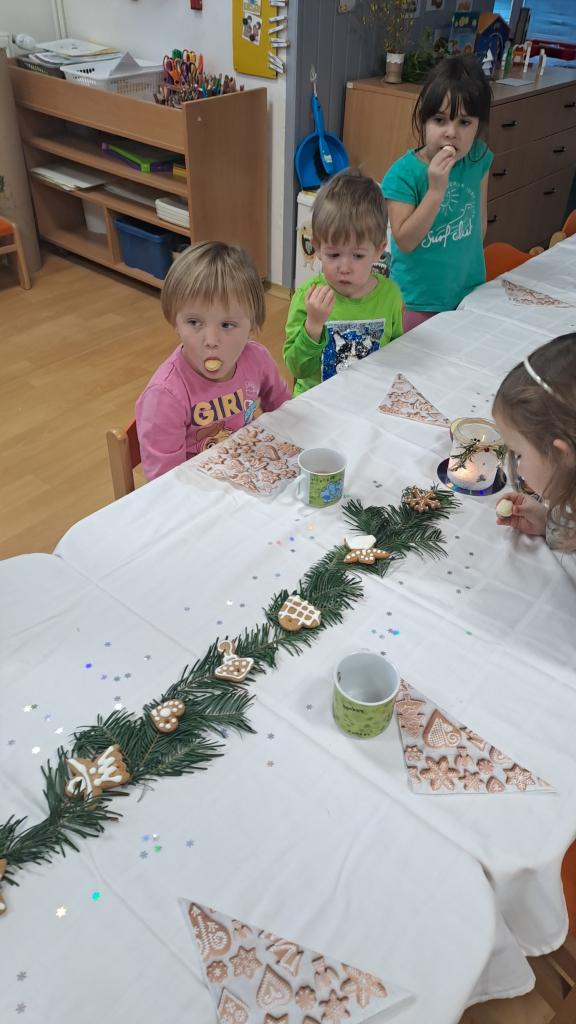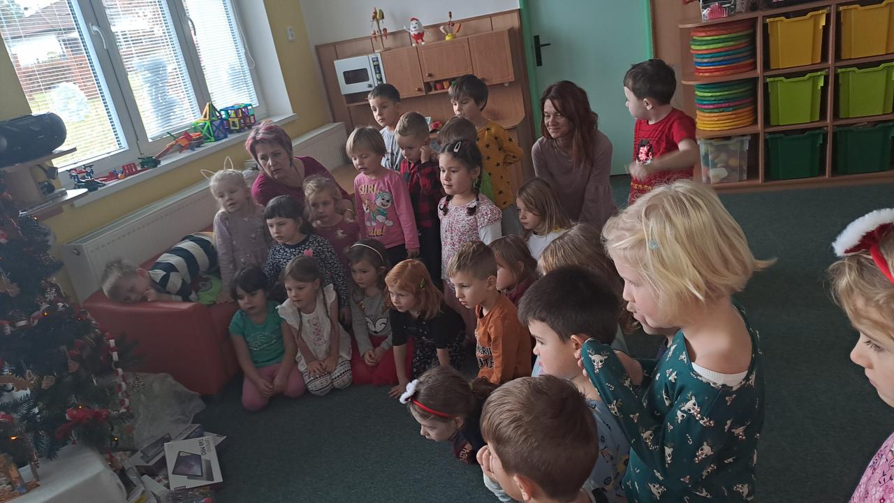 Když si Ježíšek našel cestu do školky, čemuž nasvědčovaly třpytivé stopy a přinesl stromečky plné perníčků, to bylo teprve radosti. V prostředním oddělení některé děti neodolaly a jako myšky perníčky okusovaly. Při setkání s rodinami předvedly na jednotlivých odděleních-hry a písničky, pohádkovou improvizaci a spolupráci s rodiči, nejstarší vystoupily s dramatizací pohádky a písněmi. Nakonec si všechny přítomné děti rozbalily dárek knihu od Ježíška(rodiče). Další den si společně užily pravý Štědrý den. Pokus s prskavkou, pouštění lodiček, rozkrajování jablíčka, rozloupnutí oříšku, hod střevícem. Pak se kouzlem pod stromky objevily dárky. S šupinkou pod talířem u slavnostně prostřeného stolu se děti pustily do rybí polévky, obalovaného filé s kaší a oblohou. Ve Sluníčkách si pochutnaly na třech vlastnoručně vyrobených druzích cukroví. Poslední den jsme byly pozvaní do ZŠ na program žáků- Expedice Apalucha. Prohlédly si vánoční školu a zvířátka o která se školáci starají.