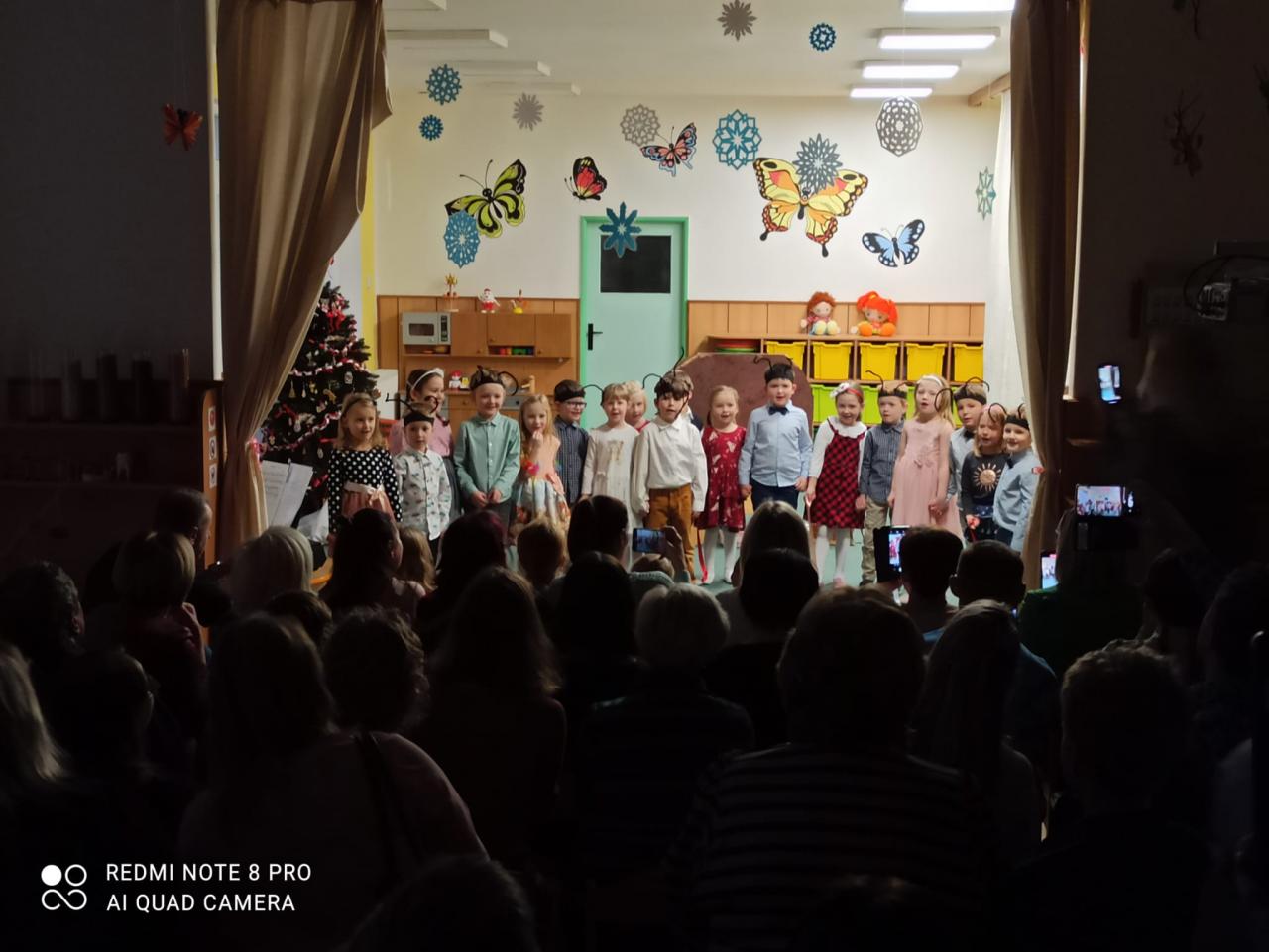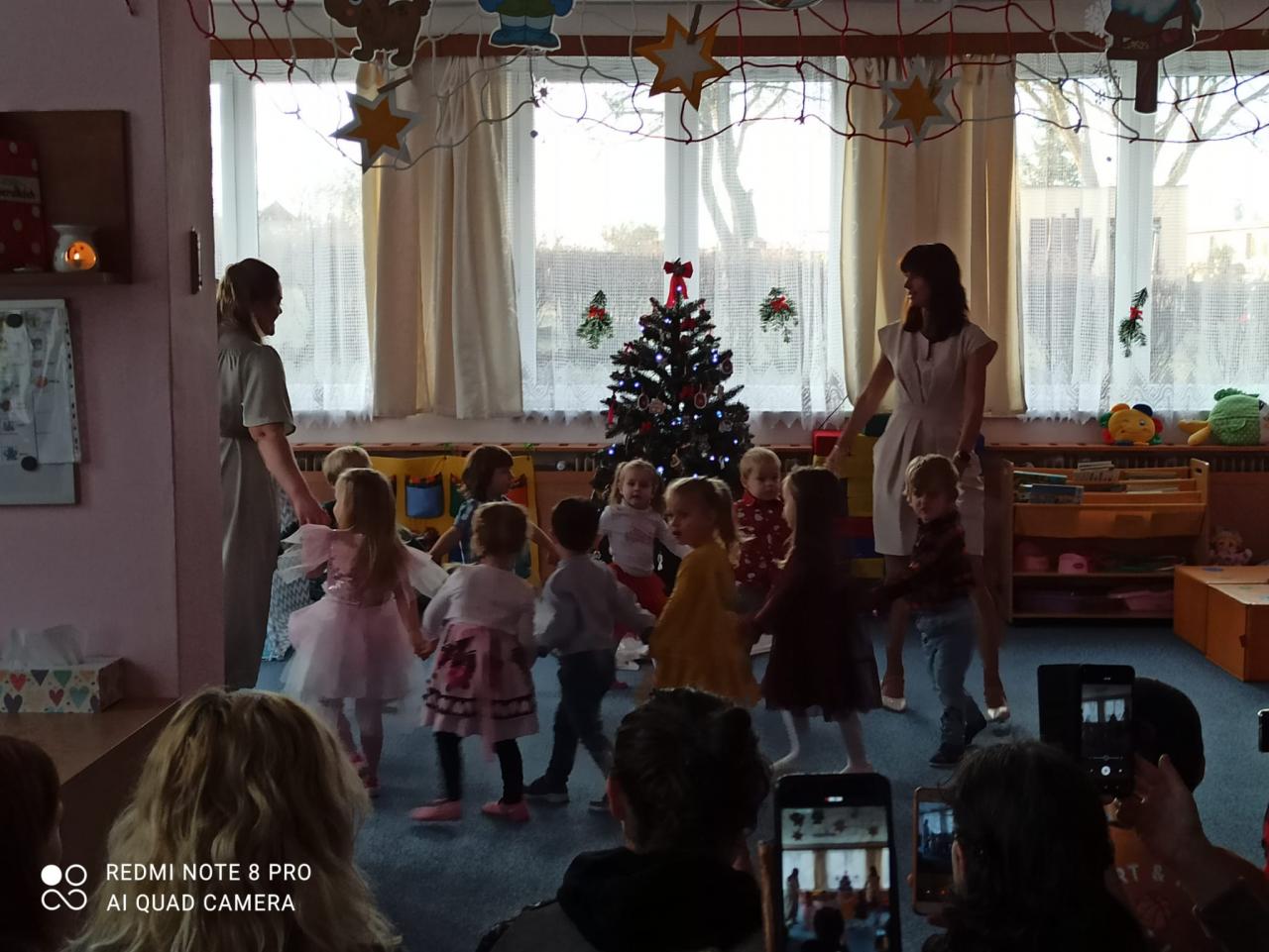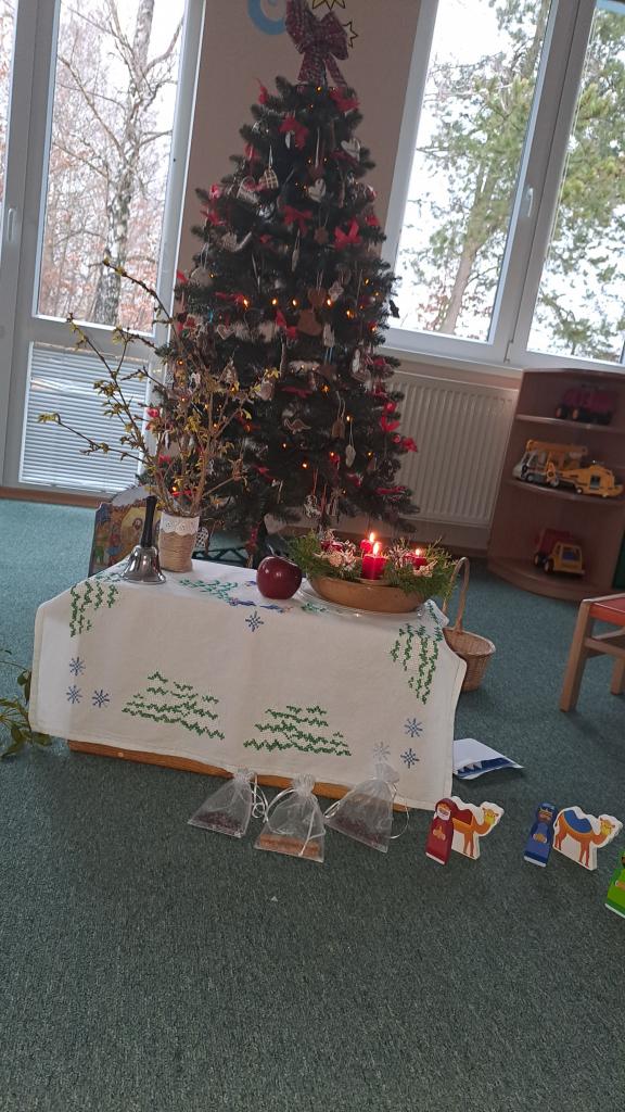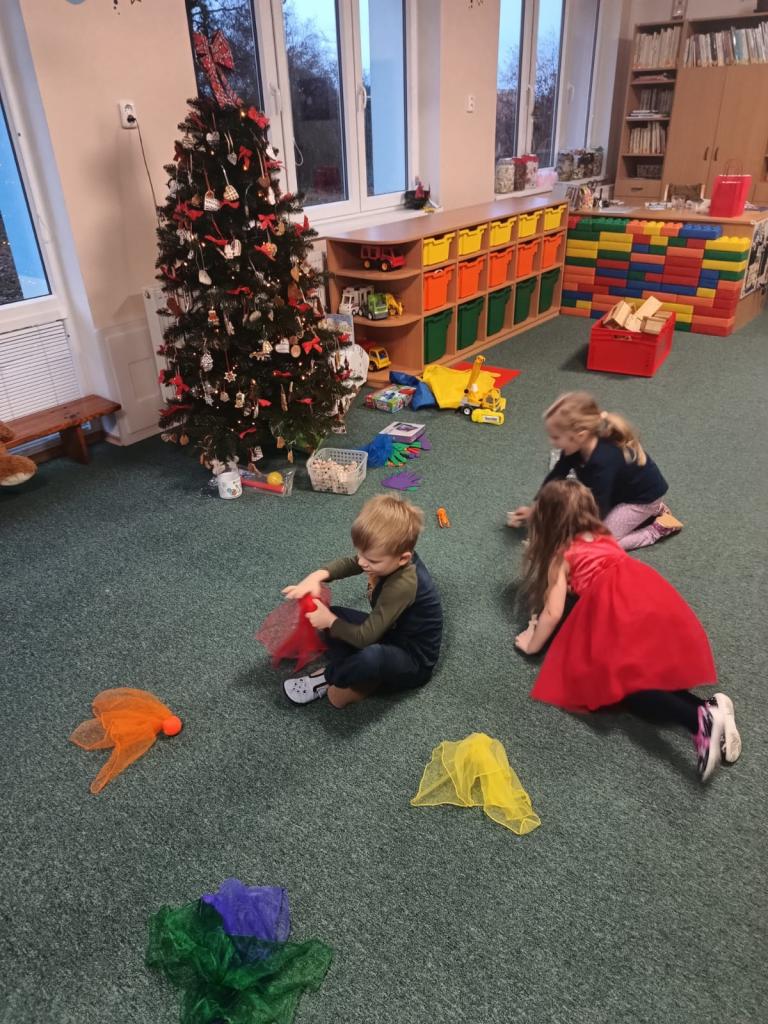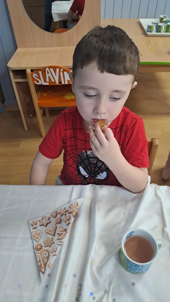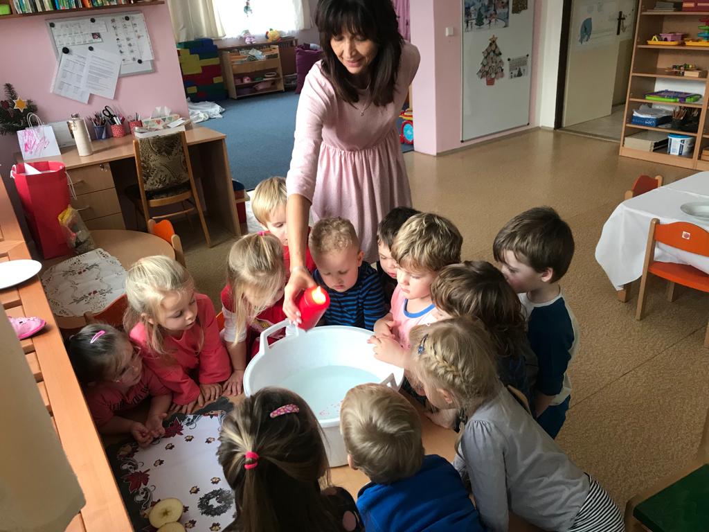 Když si Ježíšek našel cestu do školky, čemuž nasvědčovaly třpytivé stopy a přinesl stromečky plné perníčků, to bylo teprve radosti. V prostředním oddělení některé děti neodolaly a jako myšky perníčky okusovaly. Při setkání s rodinami předvedly na jednotlivých odděleních-hry a písničky, pohádkovou improvizaci a spolupráci s rodiči, nejstarší vystoupily s dramatizací pohádky a písněmi. Nakonec si všechny přítomné děti rozbalily dárek knihu od Ježíška(rodiče). Další den si společně užily pravý Štědrý den. Pokus s prskavkou, pouštění lodiček, rozkrajování jablíčka, rozloupnutí oříšku, hod střevícem. Pak se kouzlem pod stromky objevily dárky. S šupinkou pod talířem u slavnostně prostřeného stolu se děti pustily do rybí polévky, obalovaného filé s kaší a oblohou. Ve Sluníčkách si pochutnaly na třech vlastnoručně vyrobených druzích cukroví. Poslední den jsme byly pozvaní do ZŠ na program žáků- Expedice Apalucha. Prohlédly si vánoční školu a zvířátka o která se školáci starají.