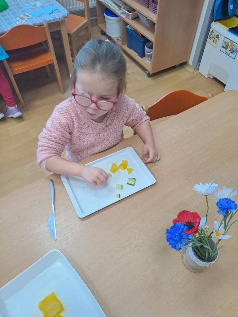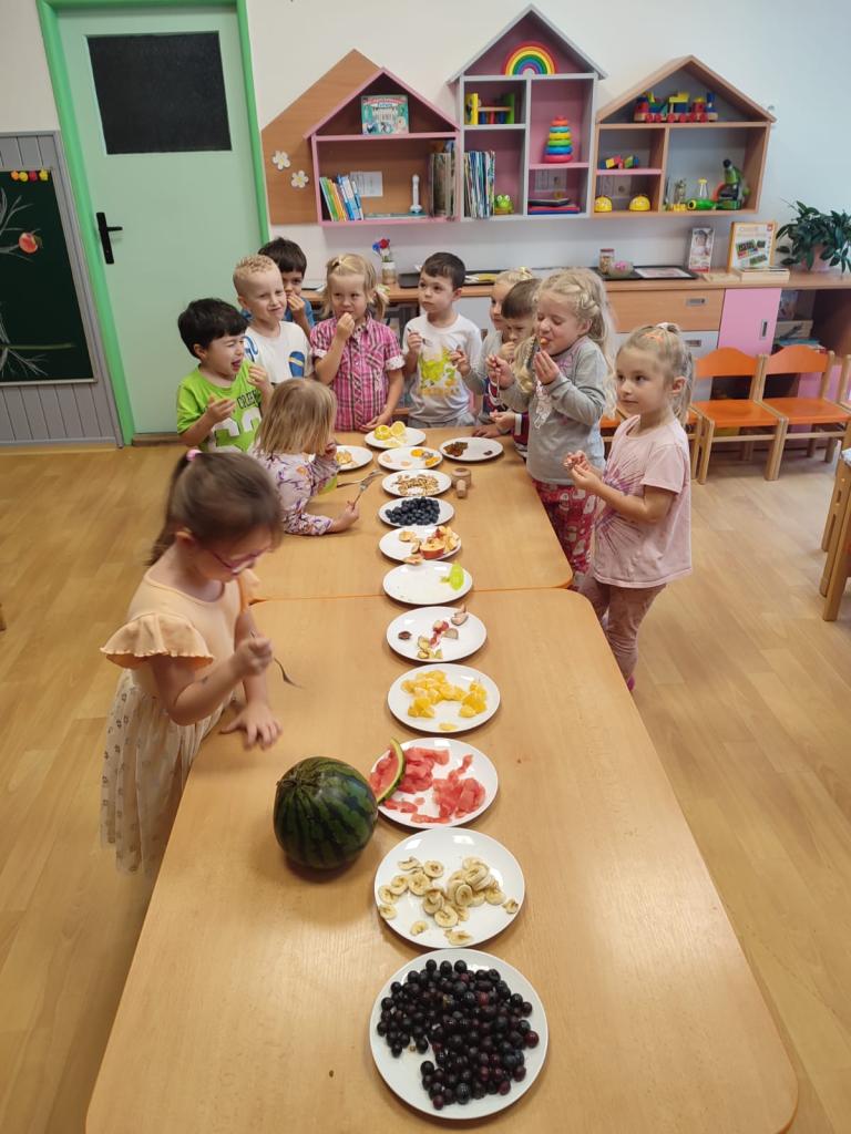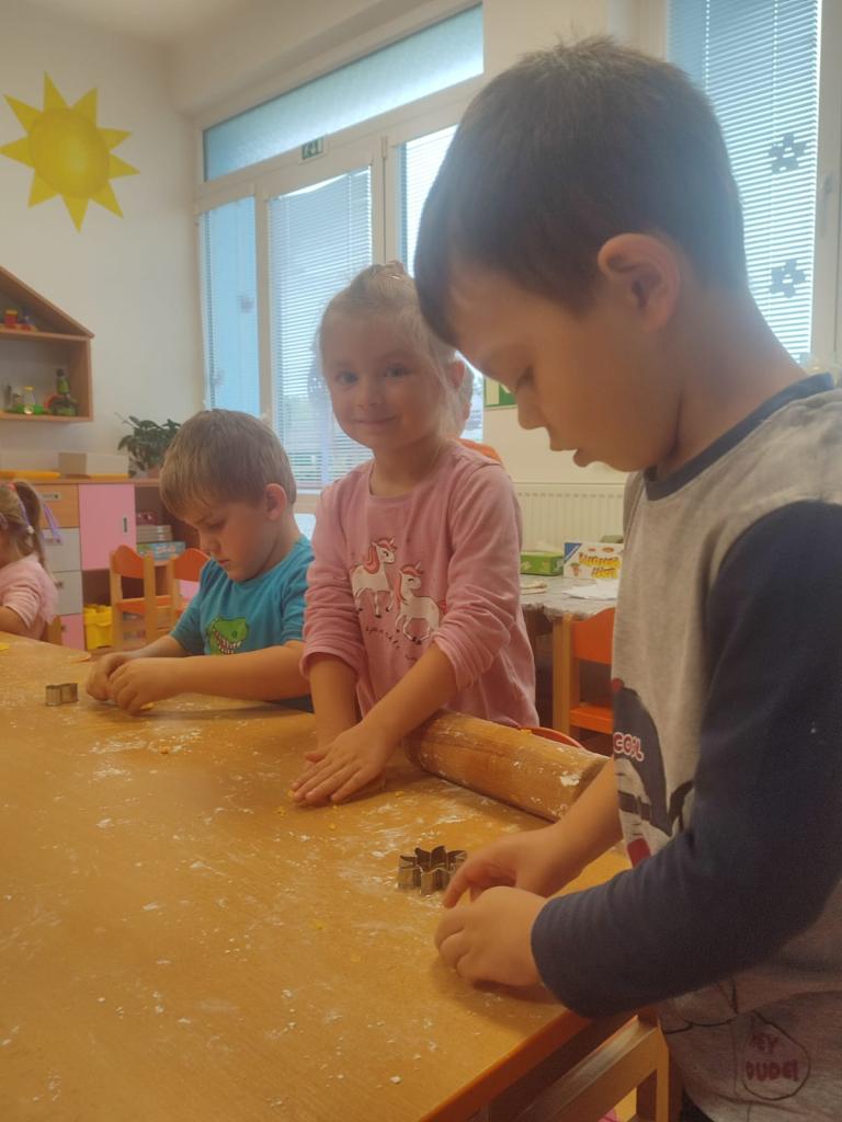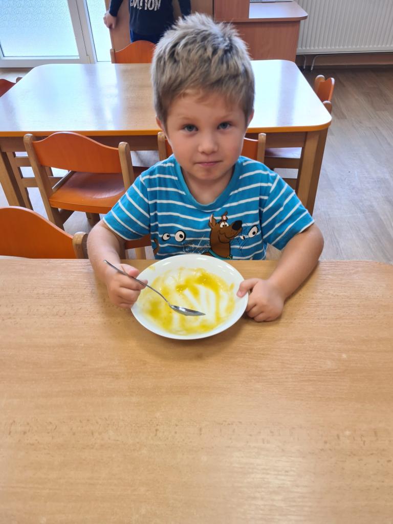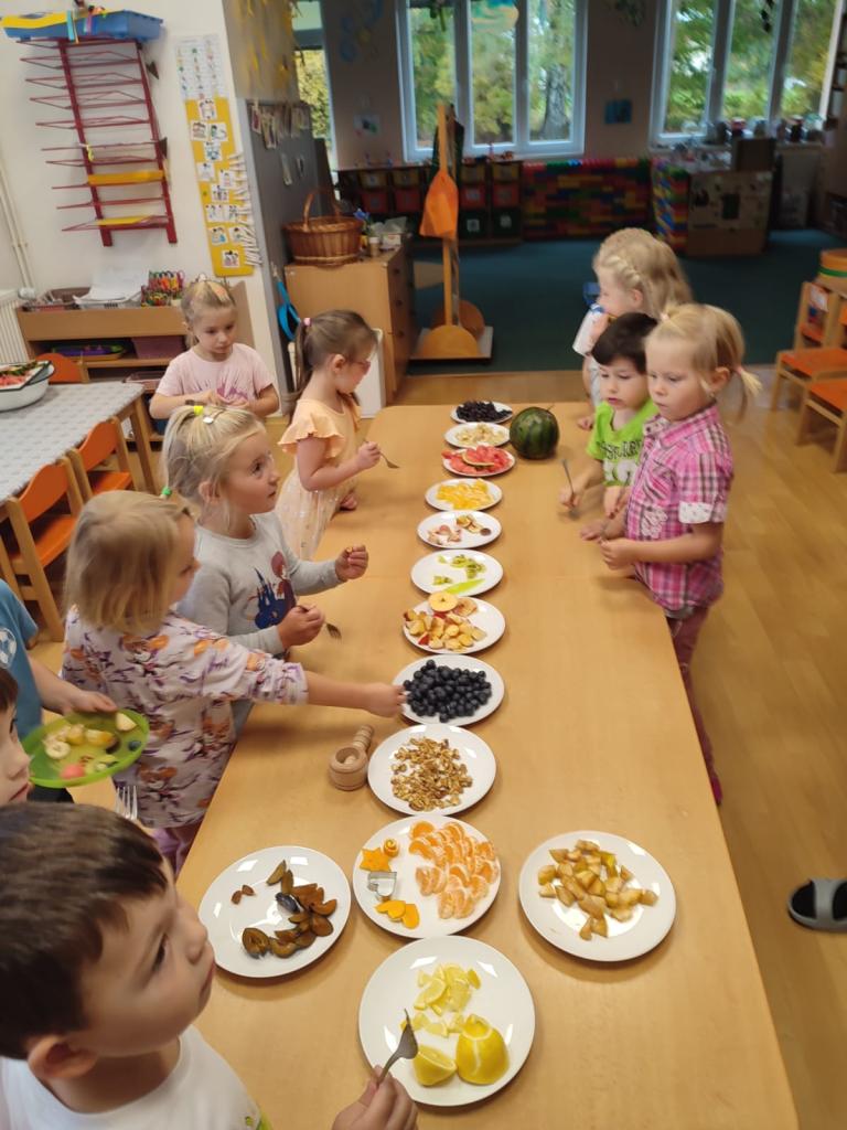 Ve všech odděleních školky se připravovaly dobroty, ochutnávky a také osvěta o zdravém stravování. Děti s paní učitelkou v Beruškách se nejprve připravovaly teoreticky. Poznávaly zeleninu a ovoce, plnily zadání her. Nakonec vařily, loupaly brambory a připravily si bramborové placičky. Motýlci očistily, nakrájely zeleninu a vařily polévku. Pochutnaly si na ní a ohlásily, že byla nejlepší a mňam. Sluníčkové děti měly brambory na loupačku. I přes rizikové strouhání připravily těsto a pekly mrkvové cukroví a naaranžovaly si ovocný raut.
