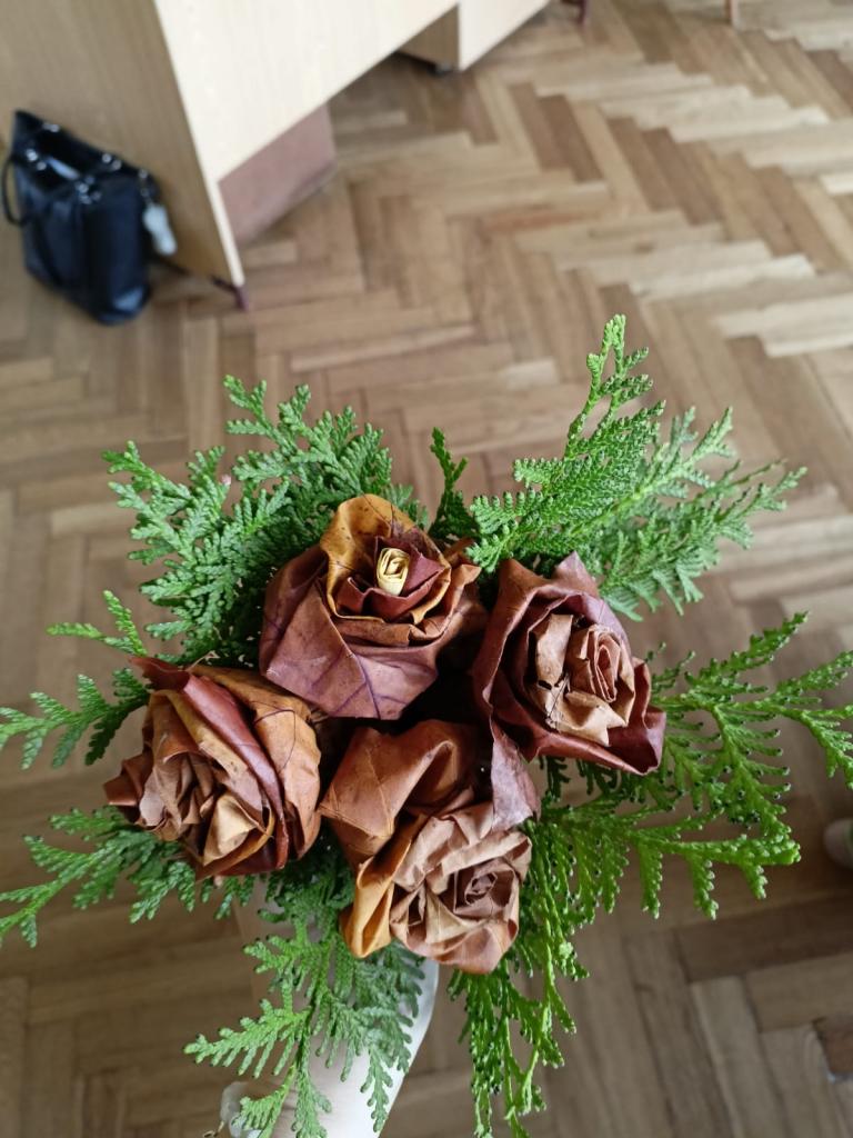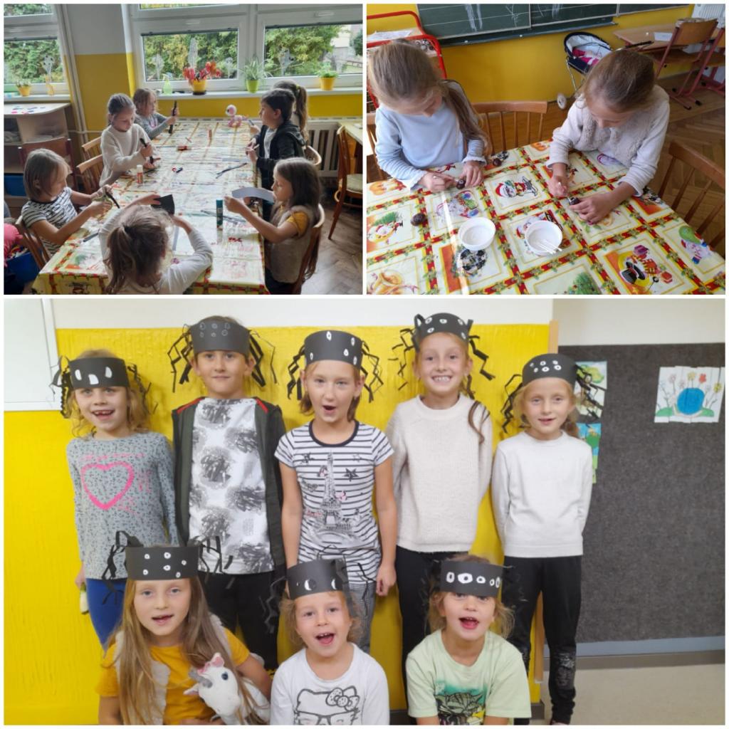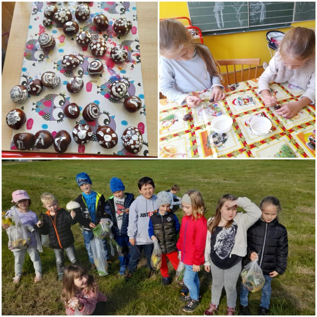 Děti se pustily do sběru a malování kaštanů i do vyrábění pavoučích čelenek. Listy, které jsme posbírali na školní zahradě, jsme přetvořili do krásných růží a darovali kytičky.