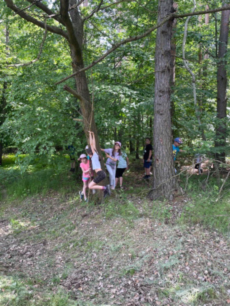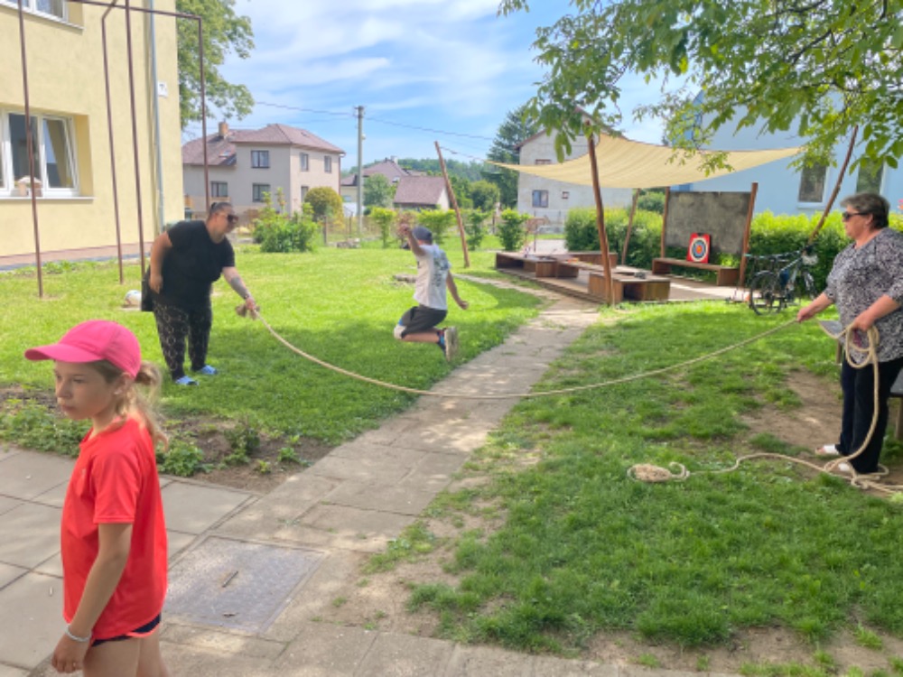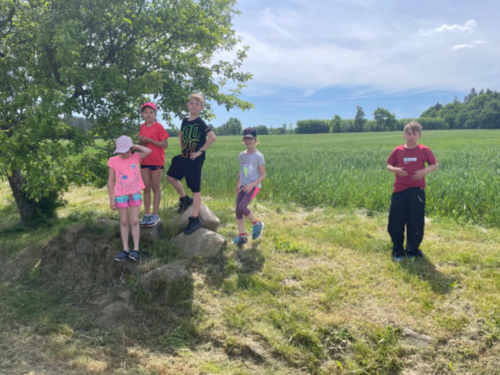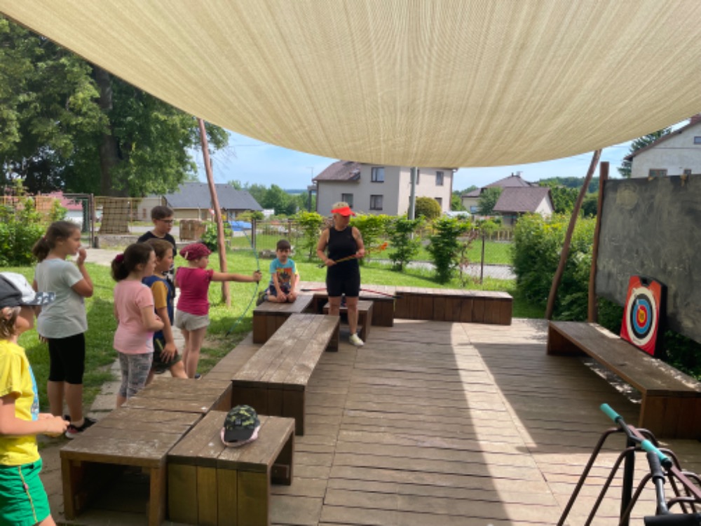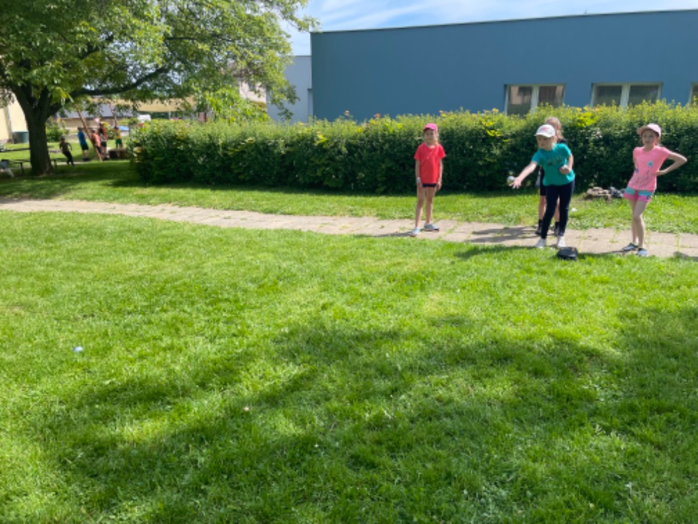 Další překvapení přišlo ve „studené podobě“ - nanuky a Kinder mléčný řez byly fakt moc dobré a osvěžující. Po „zchlazení“ si děti změřily své síly na školní zahradě na šesti stanovištích – kuželky, lano, petangue, skok z místa, střílení z luku a  diskgolf.