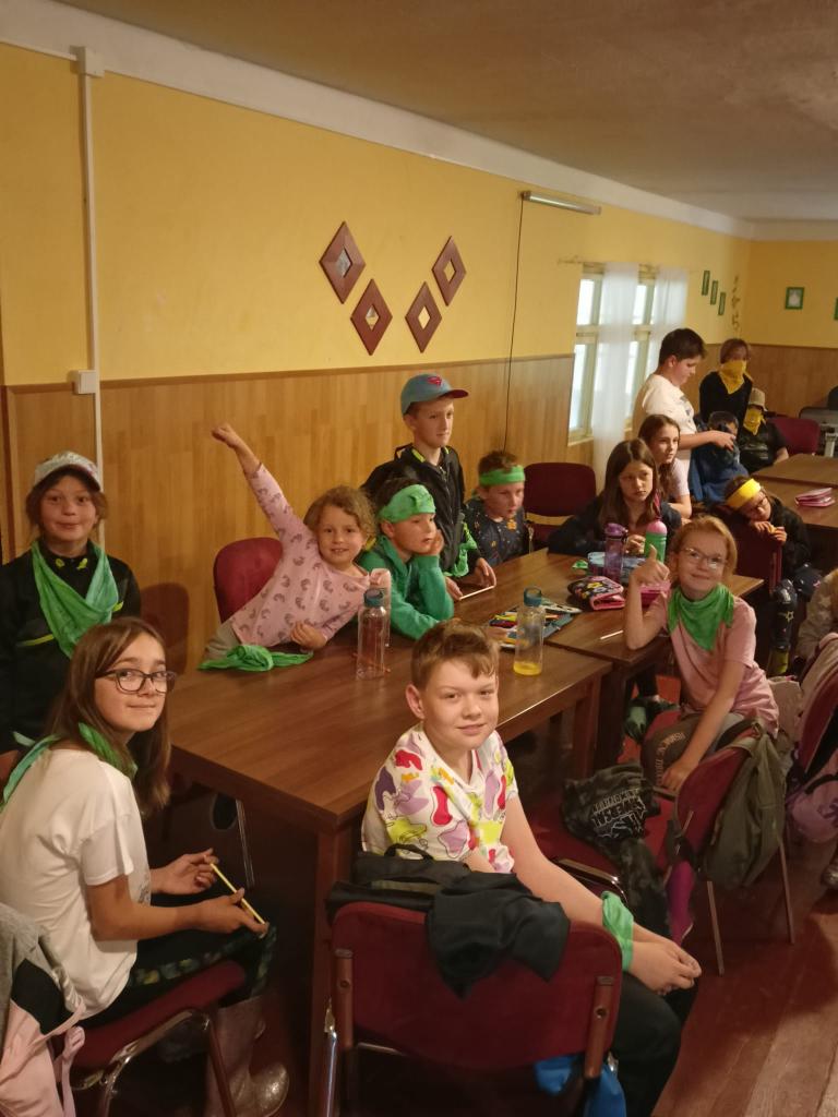 Protože byla po ránu ještě mlha a počasí vypadalo nevyzpytatelně, strávili jsme dopoledne na Večernici. A tam jsme soutěžili, hráli, psali, kreslili a nasávali😊 Hra Mistr Sosák měla velký úspěch! Buďte v klidu, žádnou tekutinu jsme nepodávali. Každý dostal papírové brčko a úkolem celého týmu bylo nasát a přemístit barevné papírky do kelímku. Následoval Pohyblivý chodník. Týmy dostaly 2 papíry a musely se přemístit z bodu A do bodu B, aniž by šláply mimo papír na podlahu, která představovala lávu. U čeho jsme se ale hooodně zasmáli, až nám slzy tekly, byla třetí hra – Příběh na P. Z každého týmu vypadl jeden příběh. Posuďte sami.