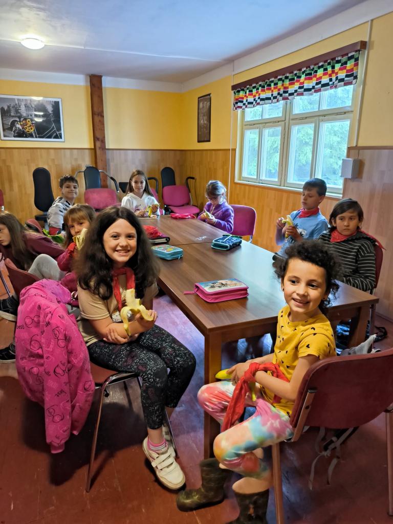 Po obědě (kuřecí stehno s rýží) a poledním klidu jsme namasírovali svaly, navoněli se repelenty a za příjemného počasí se vydali na nejdelší a nejnáročnější výlet z celého týdne – na Čtyři palice. Cestou jsme zažili druhý pořádný šok - první bylo ranní nevstávání😊a to velmi příjemný až neskutečný. Představte si, že téměř všechny děti (27) dokázaly po 1 km ulovit bobříka mlčení. To bylo tak úžasné! Kdybyste slyšeli to ticho! Povídala jenom ta příroda. Někdo si sáhl na dno svých sil a na někom byste nepoznali, že má v nohách 1000 mil (pardon, 10 km). Odměnu si zasloužily a konečně si mohly něco nakoupit.